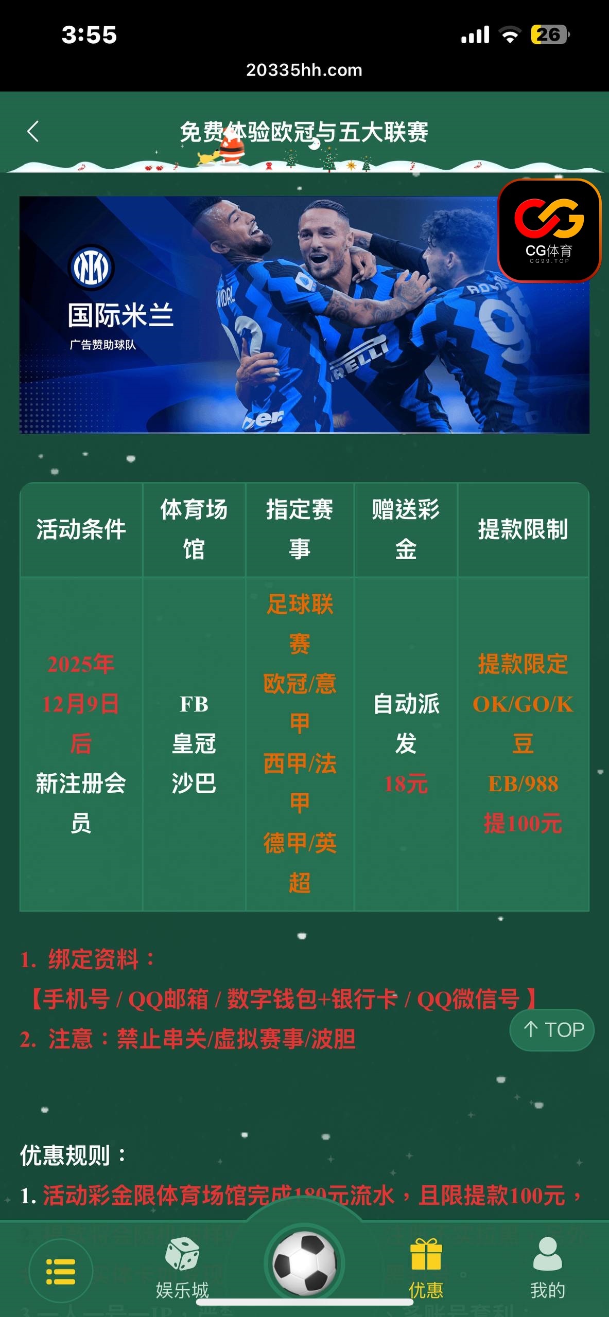 新注册会员都可以领18,只能玩欧冠和五大联赛,100元提款。